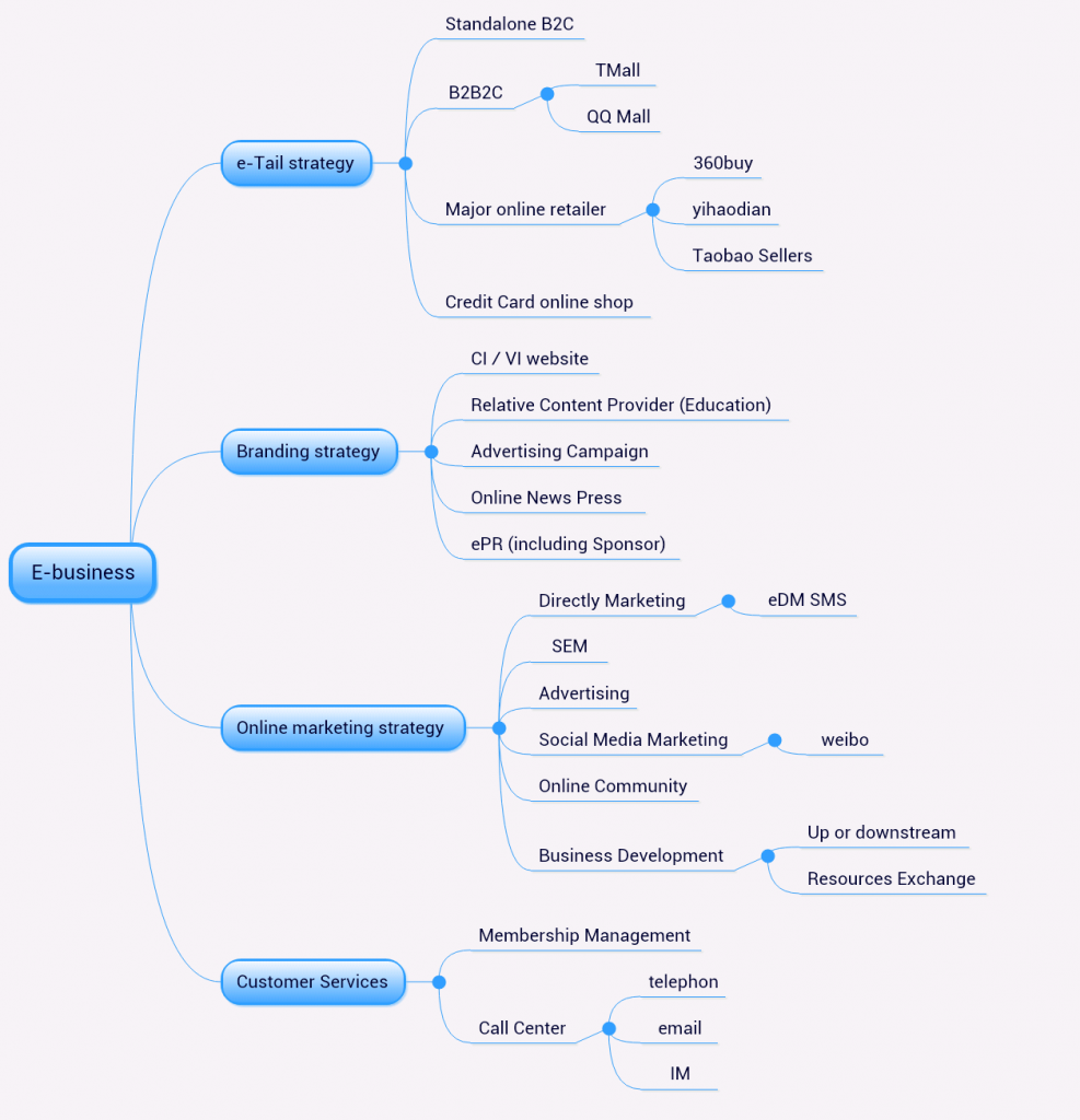 圖1、對于傳統(tǒng)企業(yè)(不管是零售商、品牌商或者即便是製造業(yè))來說,踏入internet,應(yīng)該涵蓋到了范圍,其實(shí)純粹的電子商務(wù)平臺不僅自己的 B2C,還要有完整的e-Tail政策,而且整個e-Business的布局,不能只有銷售的部分,試想實(shí)體的銷售都需要行銷與推廣,那么 internet上面是否也需要同等的布局呢?答案是肯定的,所以你也需要品牌(CI/VI)的介紹網(wǎng)站,把公司文化、品牌精神、過往的一些媒體報導(dǎo)、甚 至是一些市場教育的內(nèi)容呈現(xiàn)出來,之后當(dāng)然還要有完整的線上行銷計畫,這個才是完整的scope…