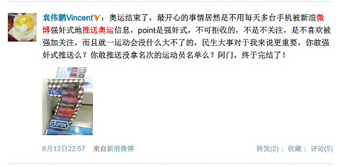 在新浪微博的奧運(yùn)版及后續(xù)版本上,默認(rèn)加了很多機(jī)制上無(wú)法關(guān)閉的推送: